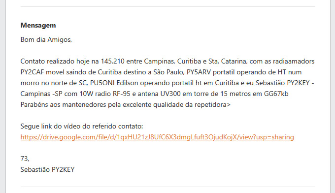 Agradecemos a mensagem de PY2KEY – Sebastião, que nos relatou sobre o alcance do repetidor PY5CTV e o excelente sinal recebido em Campinas/SP.